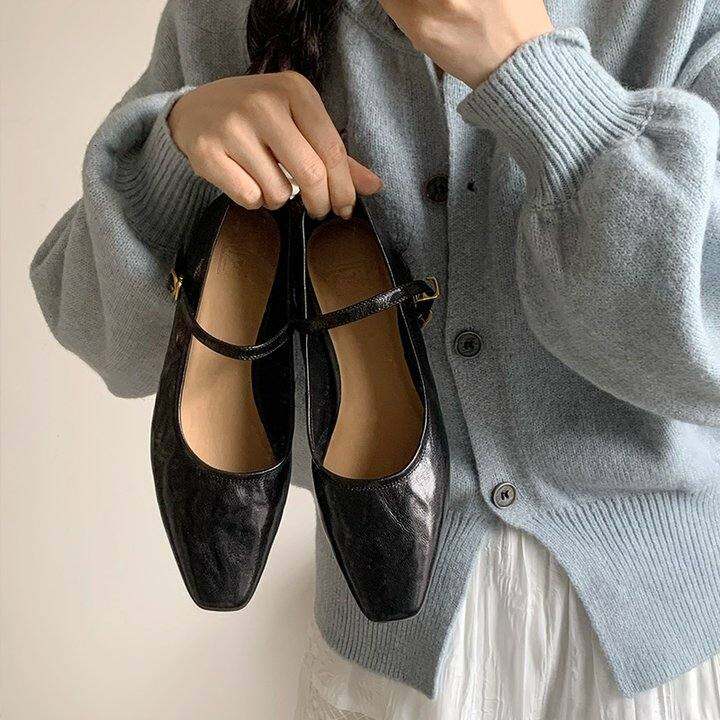 简约法式玛丽珍鞋2024新款真皮粗跟一字扣浅口单鞋复古平底鞋