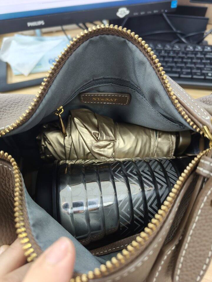 容量很大,可以放一把伞还有我的咖啡杯耳机车钥匙,早上还塞了一根玉米。那就是感觉包口有点小,但是影响不是很大。