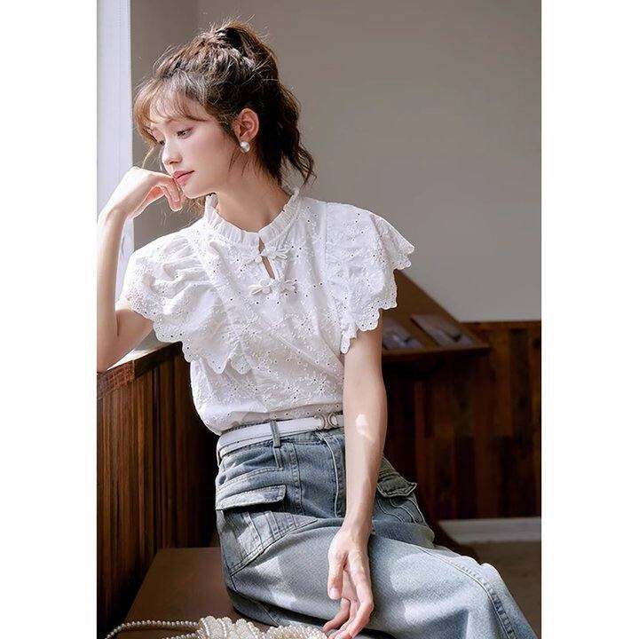 雪纺衫女2024夏季新款气质百搭显瘦千金新中式蕾丝小飞袖衬衫上衣