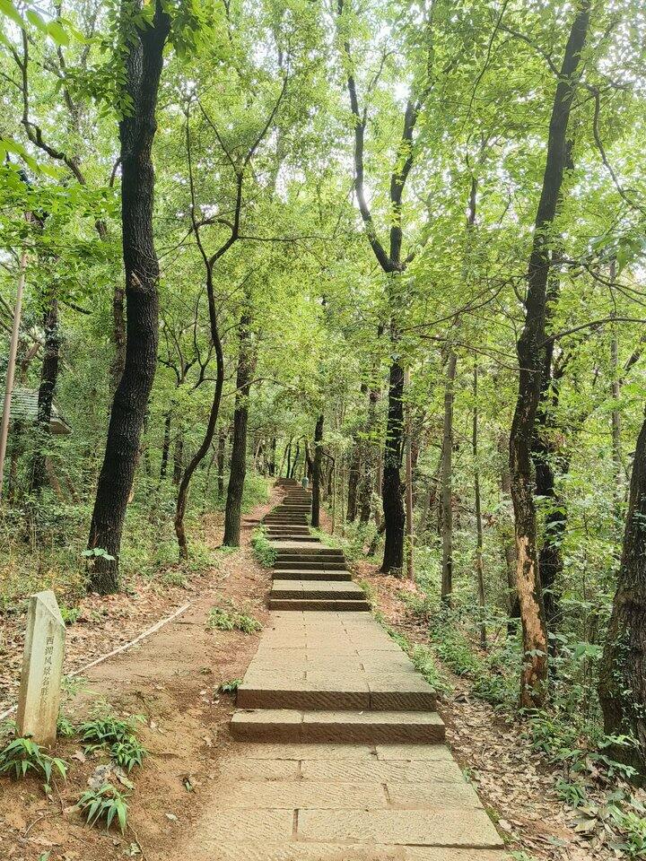 我准备爬的时候,石板小径上一个人也没有,周围都是古朴茂盛的大树,很怕一个女生碰上什么青纱帐惨案[胖鹿汗]正犹豫呢,后面来了一对祖孙,一问目的地一样,很好,有搭子了!