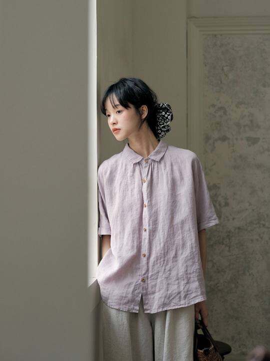 日系文艺紫色短袖衬衣女夏季新款法式复古慵懒风宽松衬衫小众上衣