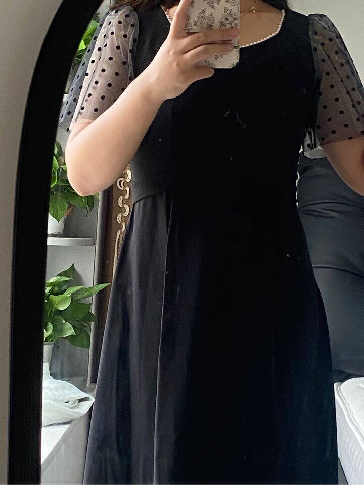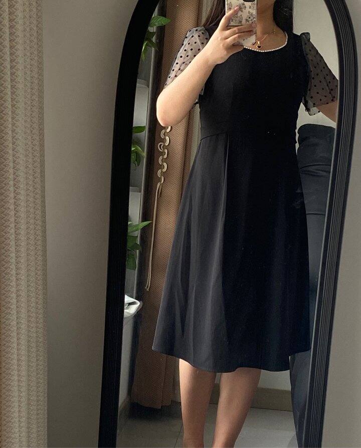 这件本来是凑单买的,凑个满减,结果这件小黑裙意外的合身,袖口的蕾丝不廉价,穿上感觉去上班很合适