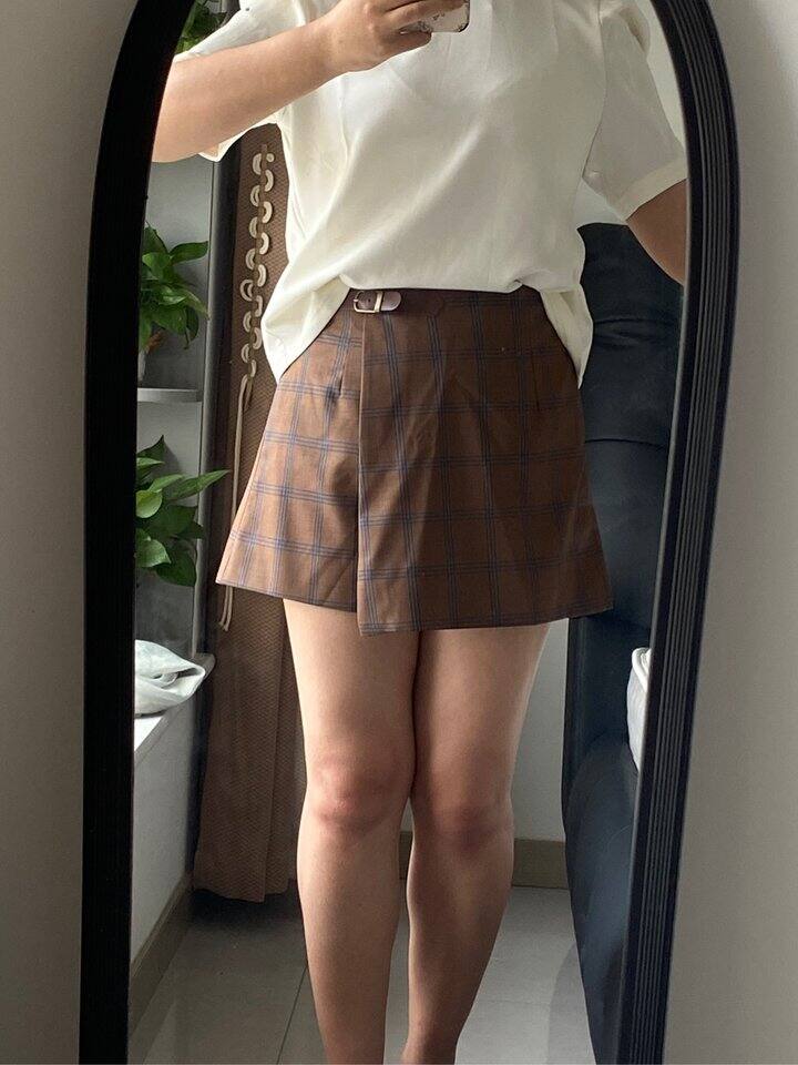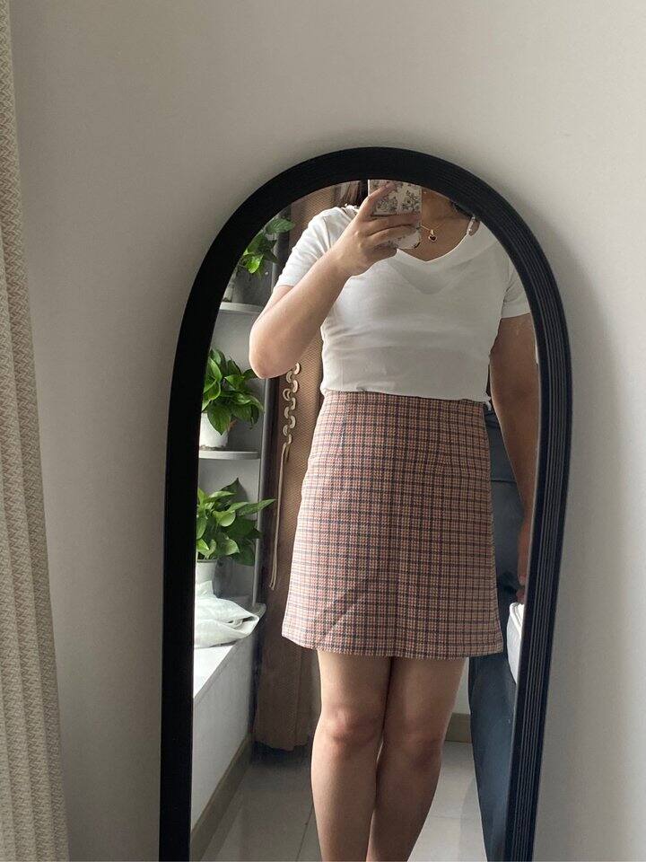 裙子材质还不错,颜色也很可以,但是对矮胖不友好,高个子瘦一点的姐妹更合适,特别是我穿这个白色上衣,太显臃肿了