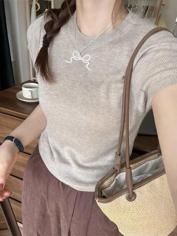 上衣是针织的,不会热,我看是浅灰色,🍑宝上面是写卡其色,也找了一张模特图。