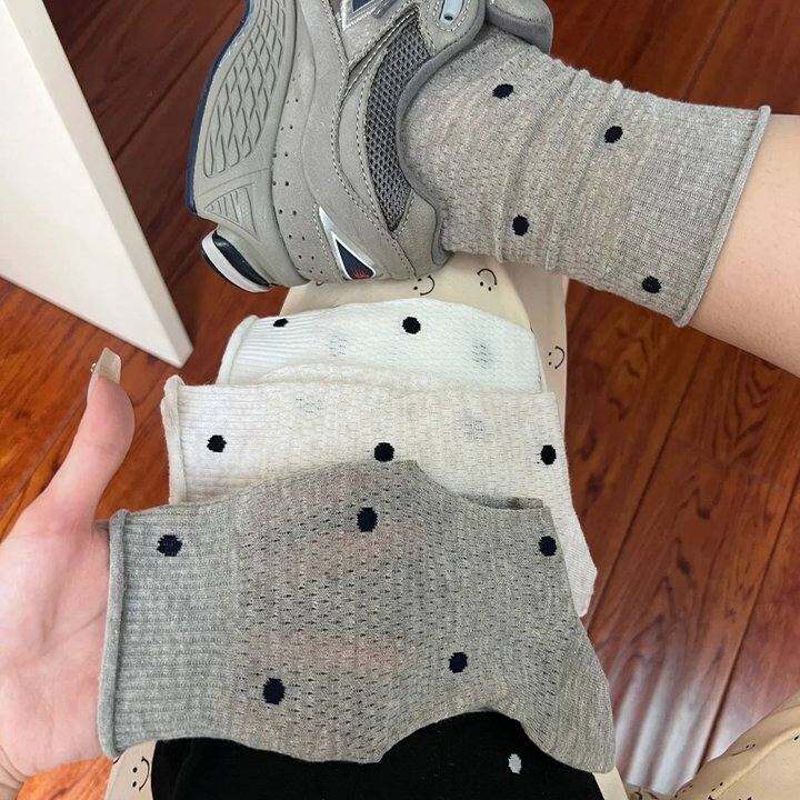 灰色堆堆袜子女夏季薄款纯棉中筒袜波点网眼透气卷边夏天芭蕾长袜