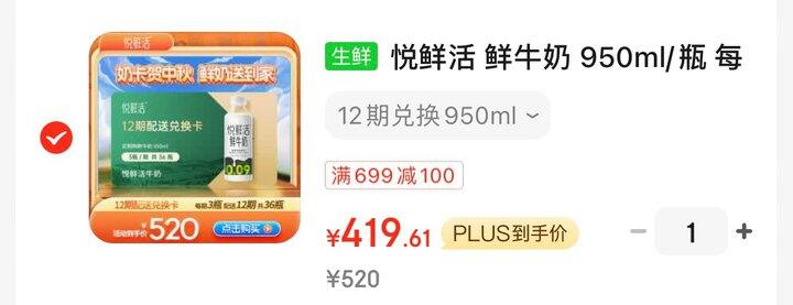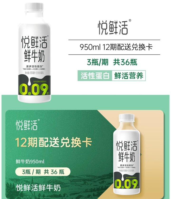 1⃣️悦鲜活鲜牛奶950ml/瓶 每期3瓶 12期兑换 ,领链接内100券后加购1件