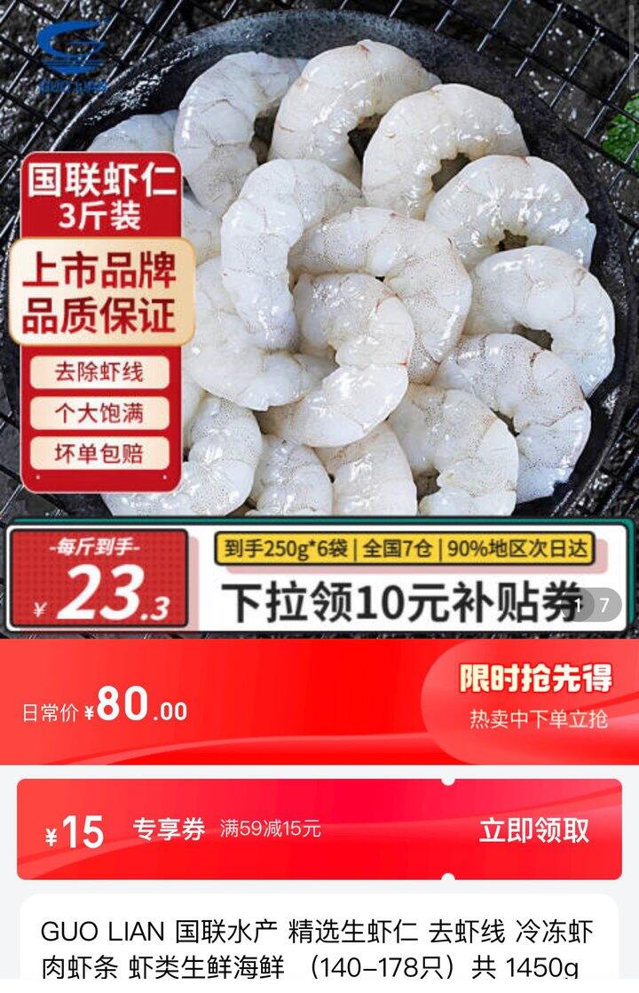 【旗舰店】国联水产 生虾仁(140-178只)共 1450g⭕️70元