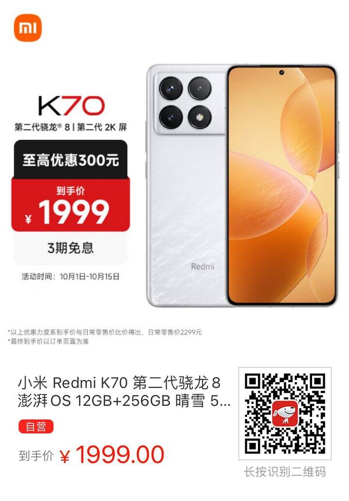 【京东】小米 Redmi K70 第二代骁龙8 澎湃OS 12GB+256GB 晴雪 5G手机 SU7小米汽车互联 AI手机