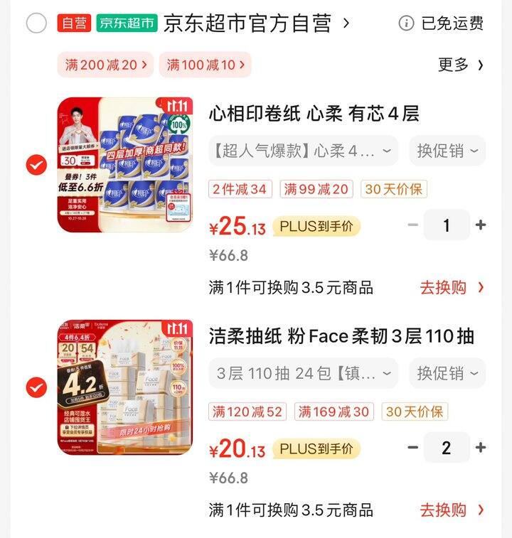 💰付65.39,可叠加白条立减,折洁柔0.83/包,心相印0.93/卷(价格不对的看看是不是没有首购礼金)