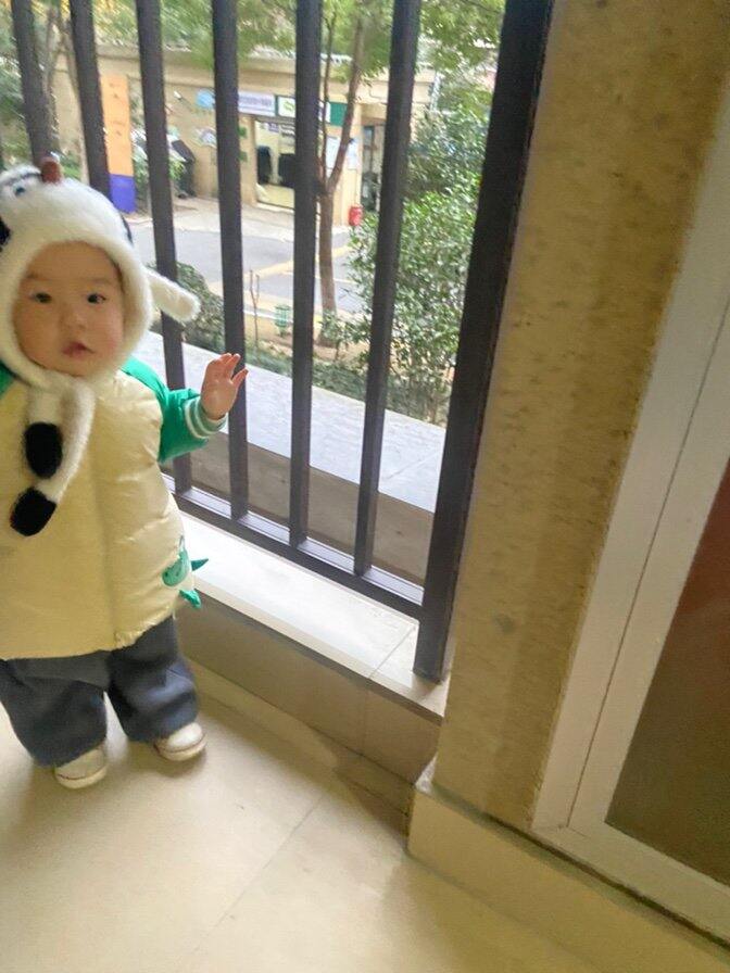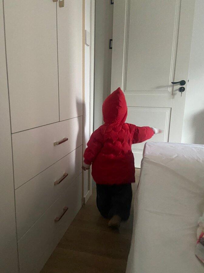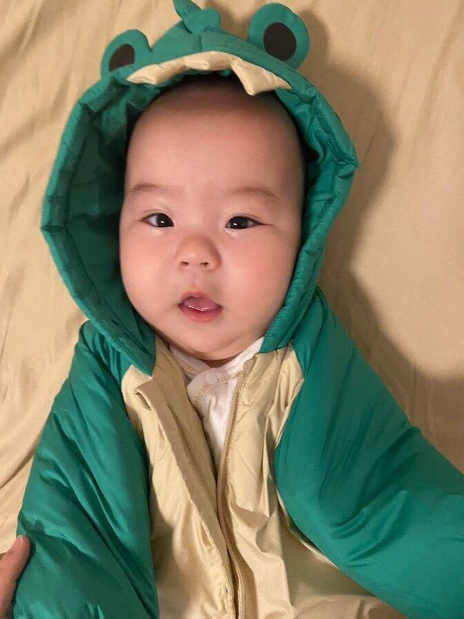 这件绿色羽绒服我们10个月左右的时候,感觉抱起来腿那里有点短,现在1岁7个月,我用小红书的方法简单做了手工改成羽绒服了,胳膊刚刚好,完美。