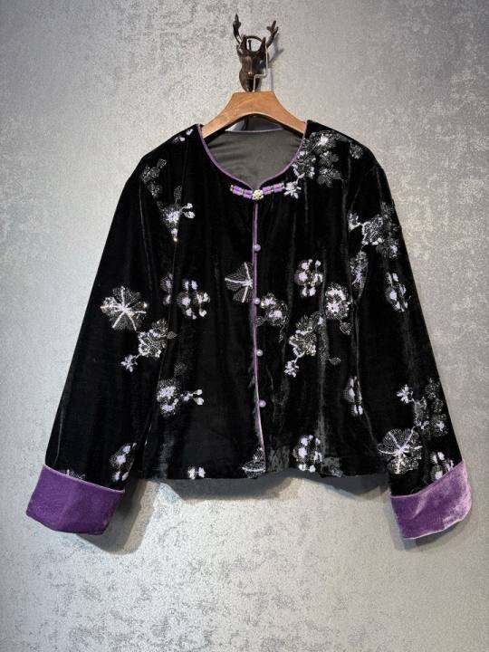 新中式国风丝绒重工亮片绣花外套女2024秋冬新款复古加棉盘扣上衣