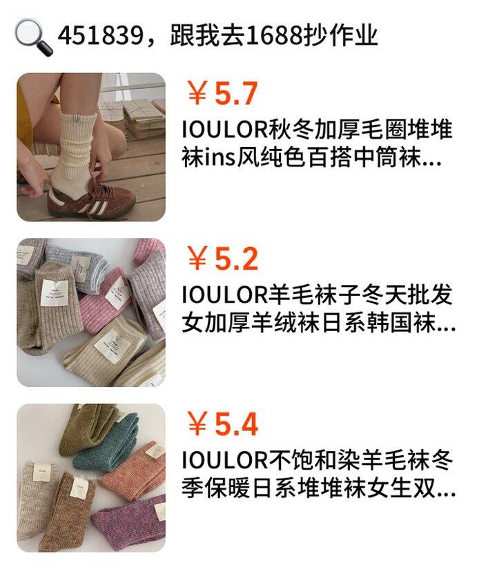 打开1688,搜索451839,直接get同款袜子🔗,也可以搜店铺名,中间那款一模一样。
