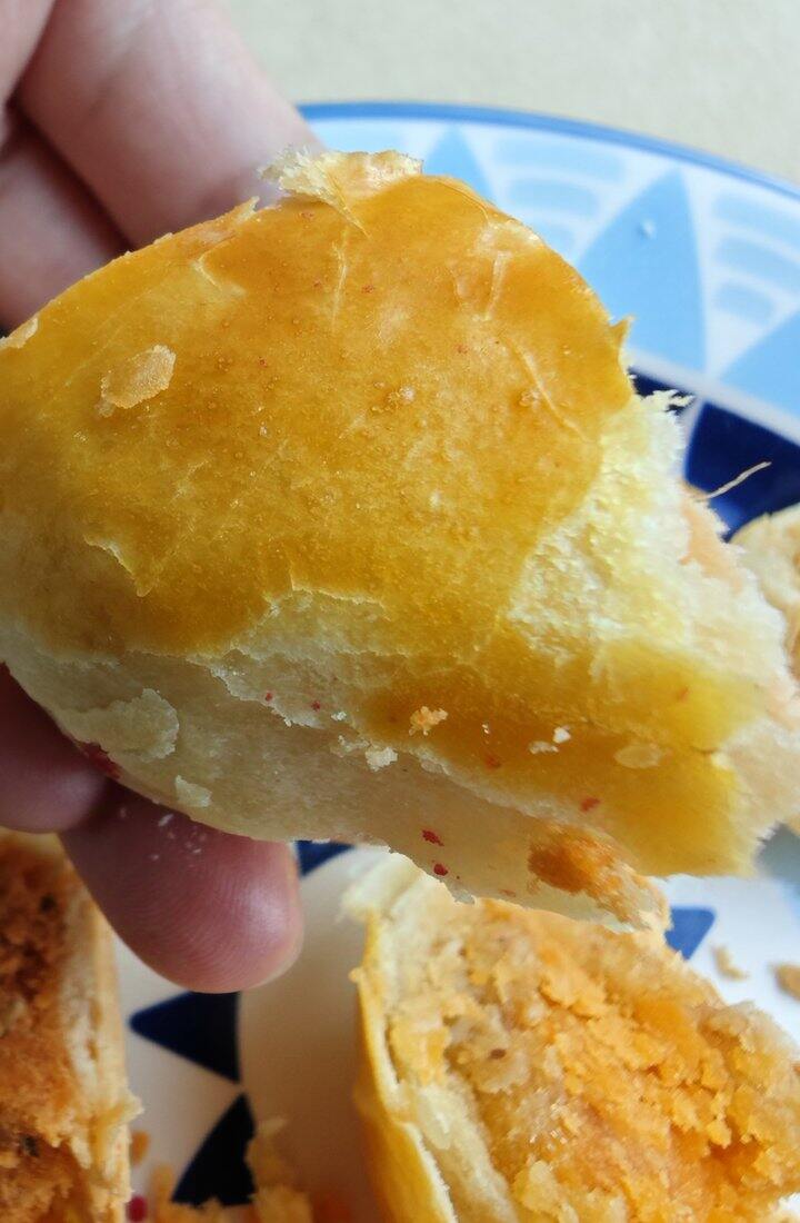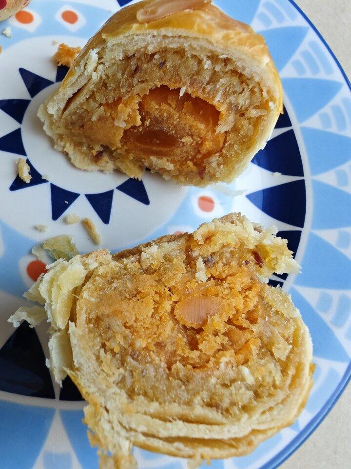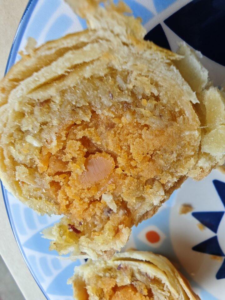 蛋黄酥的皮不干不皮,非常酥,蛋黄软硬适中,不是很咸的那种。沙沙的,颗粒感,爱了[心]
