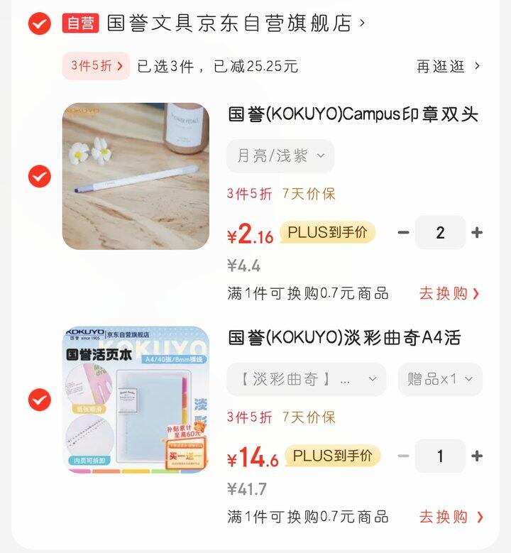 国誉本子加购物车后,反复打开,会弹出9折券,叠加3件5折优惠。