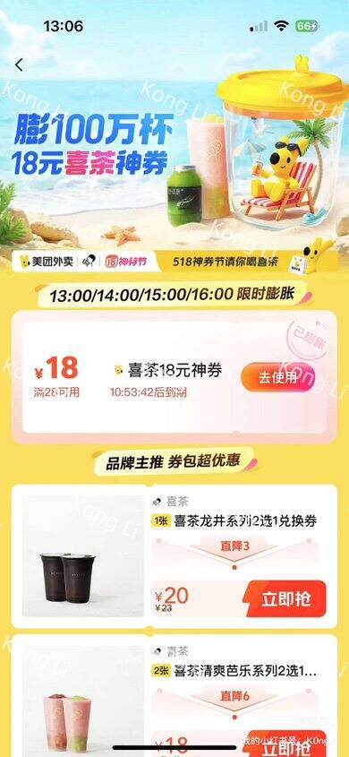 喜茶整点膨胀18元券,18-18/28-18,小姐妹得