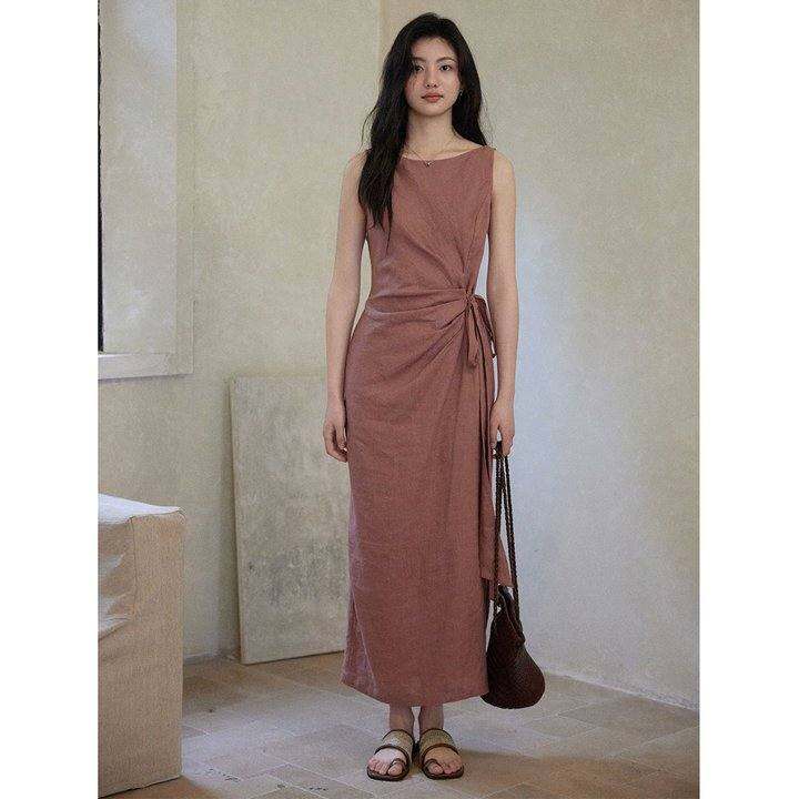 贰羊设计【乐薇】1oo亚麻圆领无袖连衣裙女系带收腰通勤百搭裙子