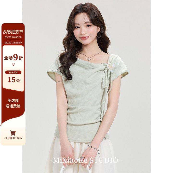 芈小可法式温柔风立体蝴蝶短袖T恤女夏季独特别致美褶皱收腰上衣