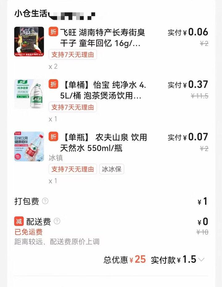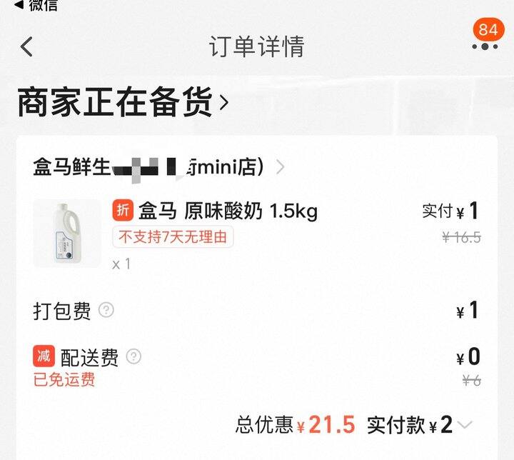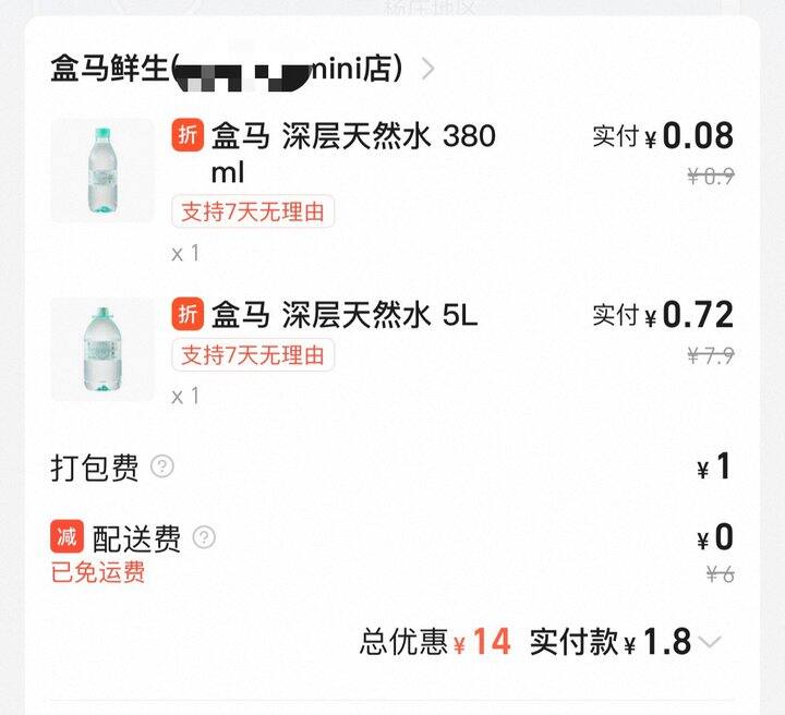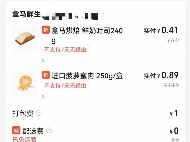 淘宝和美团都很抠,每次就算得到无门槛大红包,起送也会比红包高很多,起送不高的又不能用红包。终于今天给我薅到了不用配送费的盒马[哈哈][哈哈]