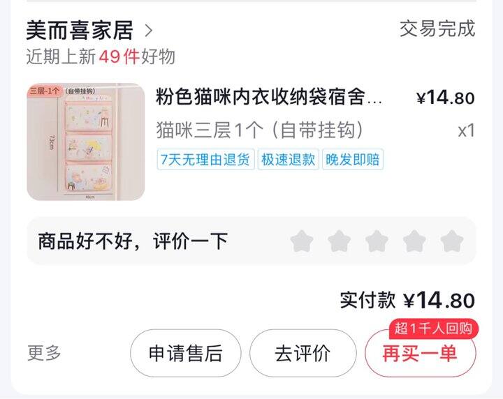 之前买过单层款,挂衣柜容易弯边,所以换成了这种款式,带拉链还有上方有铁丝固定的,放东西不会弯边,放衣柜里挂着正好靠橱柜贴边,三层很合适,一层放内衣一层放小裤一层放袜子