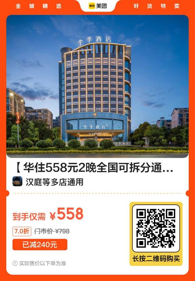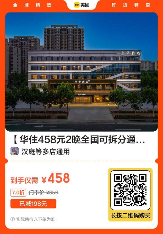 🏨 【华住558元(券后508)2晚全国可拆分通兑】全季、桔子、汉庭等品牌适用http://dpurl.cn/3QFUJcfz
