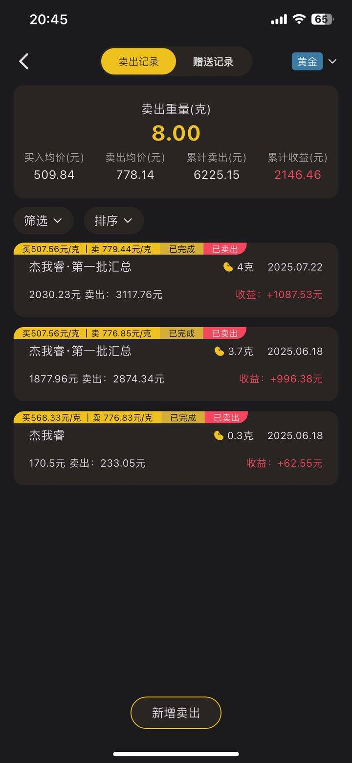 记录一下攒金入坑半年记录。今天2月才开始入坑,算很晚了,特别是最近tb各种幺蛾子,再加上工作也忙,很多都没法买了。总共到手也18克了,卖了8克,明天再卖8克。