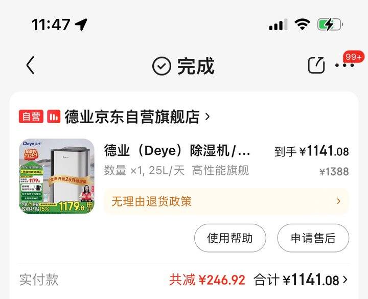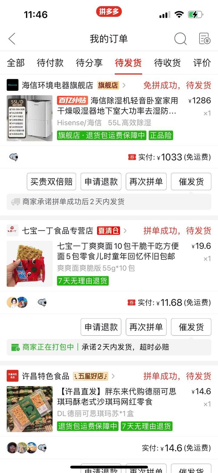 今天买的东西:海信55l除湿机,爽爽面十包,胖东来沙琪玛。收到再反馈效果。