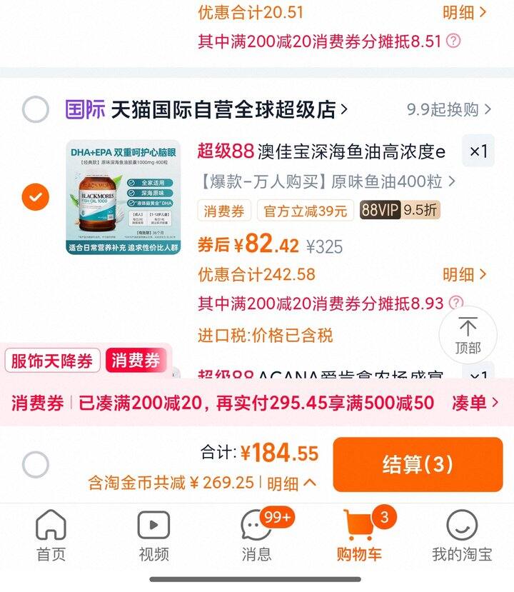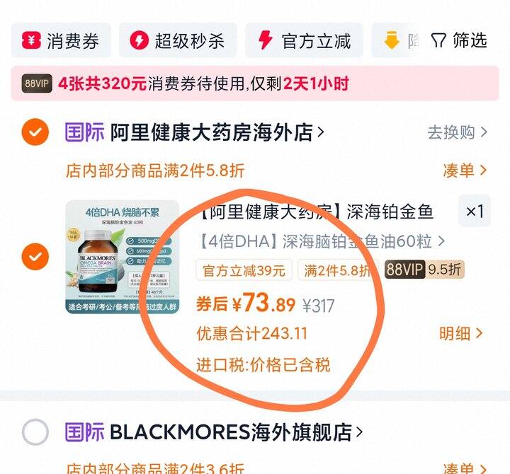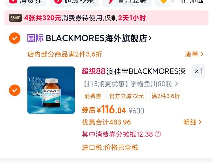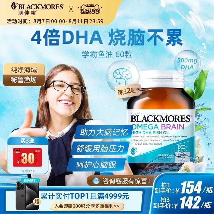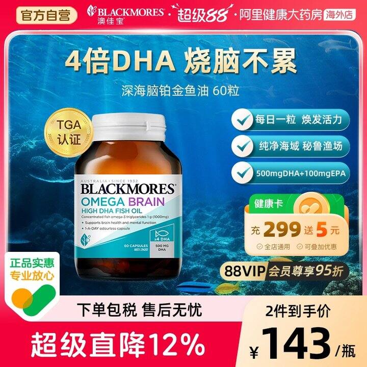 1、BLACKMORES脑铂金DHA鱼油60粒:https://m.tb.cn/h.hqFXtXT,弹7.18礼金
