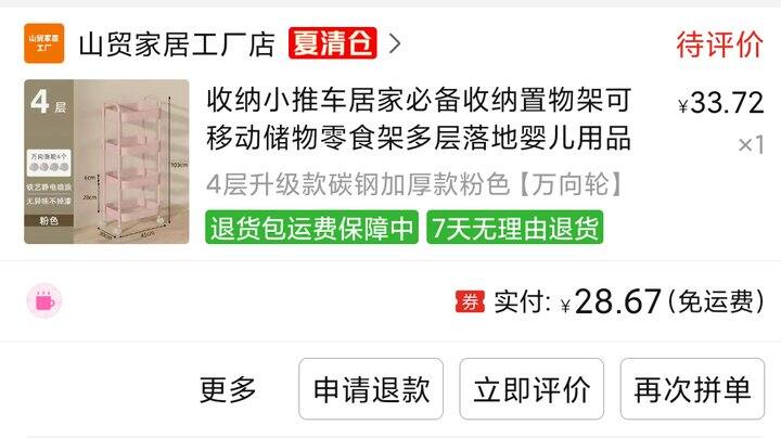 🥞一个二十多块的平价小推车,细节方面有一点粗糙但是质量对得上价钱,蛮结实的,容量很大,轮子一般般比较不难滑也不好滑,粉色有点色差不过也是好看的(四层的高度已经到一米多了,放我桌子旁边有一点高,可以自己斟酌一下三层合适还是四层)