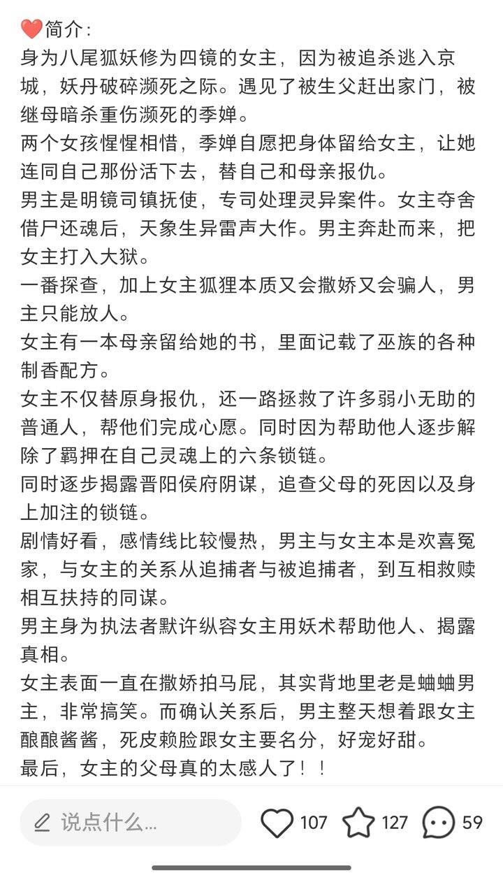 女主本是八尾狐妖,为寻妹妹来到人间,却遭人暗害。侯府这边,主母娘家遭难被流放,主母去世后,继室进门诬陷主母,致使季婵被逐。借季婵身体重生的狐,开了调香店铺,凭借巫族力量制香,助力如砚台成精为主人报仇、被毁容县主报复仇人等事件,同时一步步瓦解自己仇人的势力。