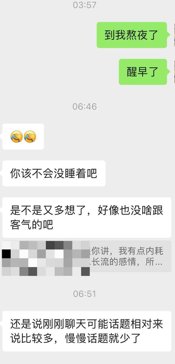 终究败在核心不够稳,上头了,积极回应男生,然后发现男生变得冷淡,聊天中带着客气、疏远,不确定是不是我敏感、爱乱想,现在是内耗状态,在考虑要长痛不如短痛,就此结束。