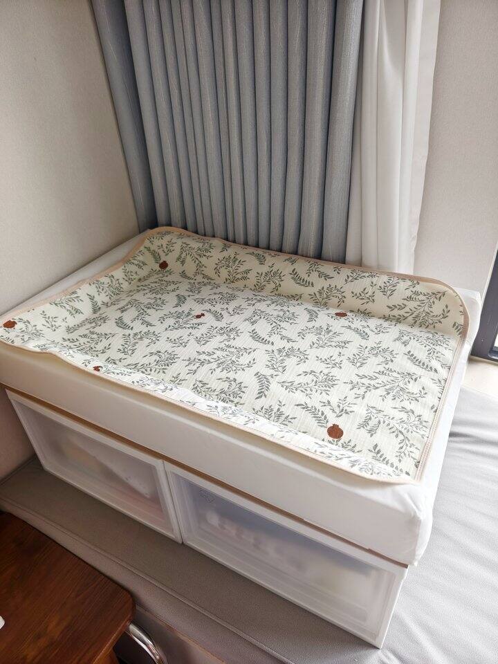 ↓这个是淘宝买的小尺寸隔尿垫,放宜家的尿布台上刚好。但其实一次性隔尿垫用的最多,嘿嘿! 可水洗隔尿垫使用频率不高。