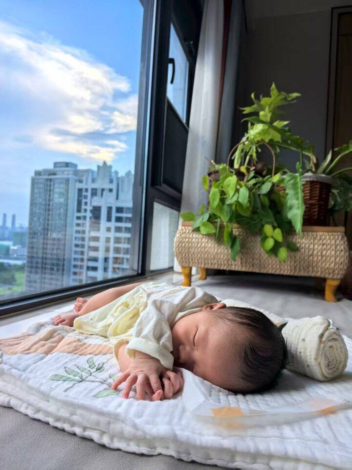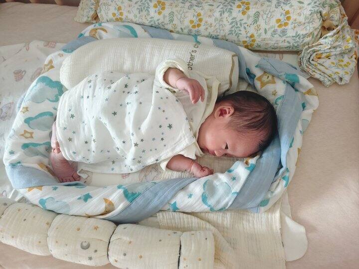 从上到下分别是:荞麦枕、竹棉纱布浴巾卷成一圈包围住、决明子枕靠着背、崽、月嫂阿姨用纱布包被卷成的自制糖果枕。