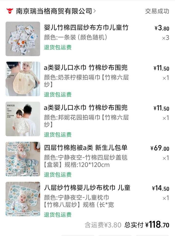 这家店我最推荐的是60*60cm的双层竹棉纱布,很轻薄,适合天热的时候当新生儿盖毯。不过前面我说的纯棉纱布长方巾还有竹棉纱布小方巾都可以盖,不用像我一样买这么多[哭笑]