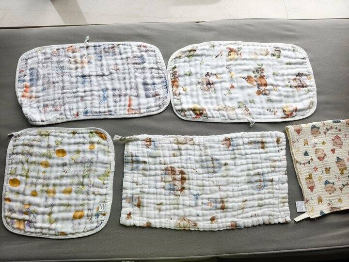 25*50cm尺寸的纯棉纱布长方巾的实用性更佳,拍嗝、垫在脑袋下面防止溢奶弄脏被子、洗澡的时候盖肚子……当垫巾时,月嫂喜欢把没有花纹那面朝上,让宝宝脸贴着没有花纹的那面。