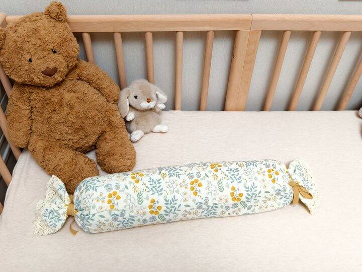 但是65cm的长度,对新生儿来说太大了。目前纯放在床边当装饰。使用频率最高的还是淘宝买的这个决明子糖果枕,不容易被踢开。