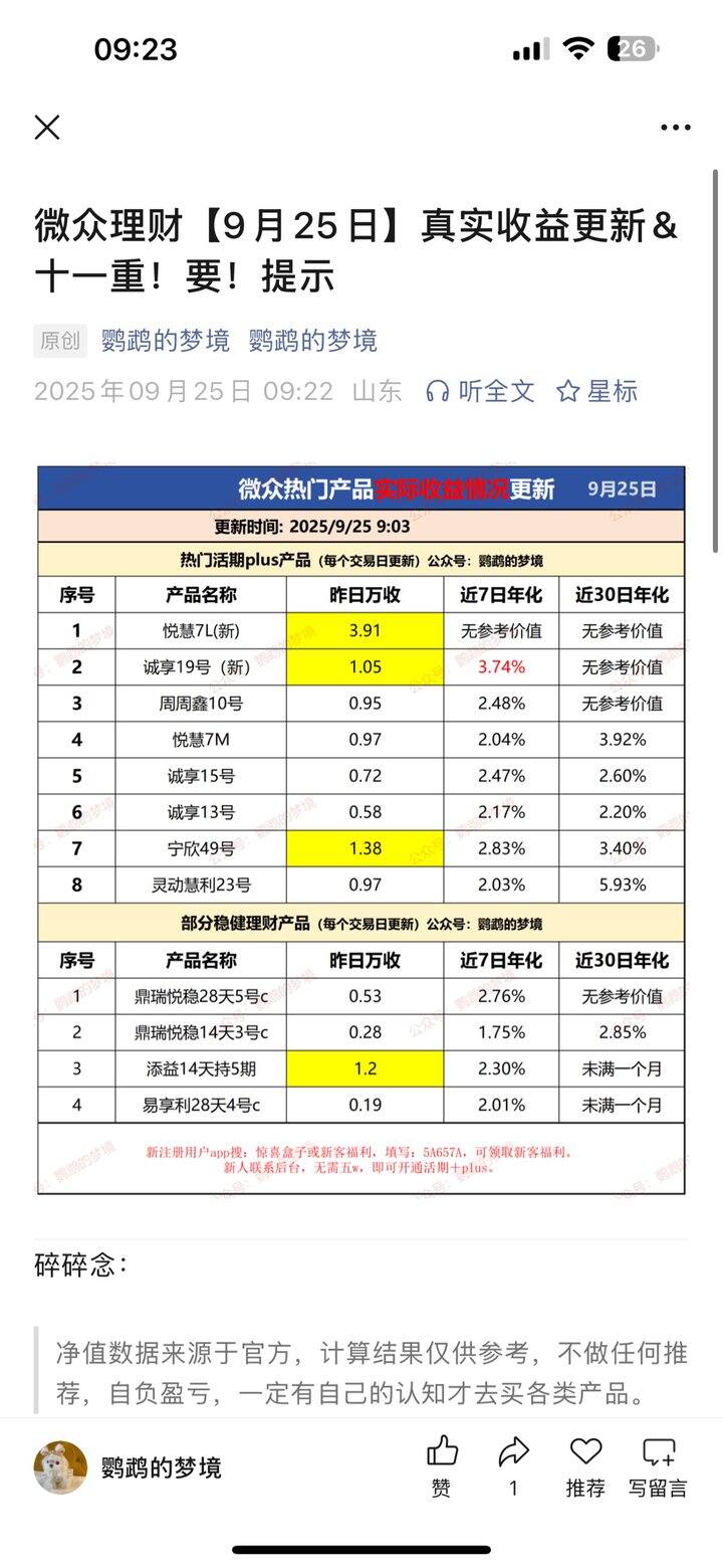 微众理财【9月25日】真实收益更新&十一重!要!提示