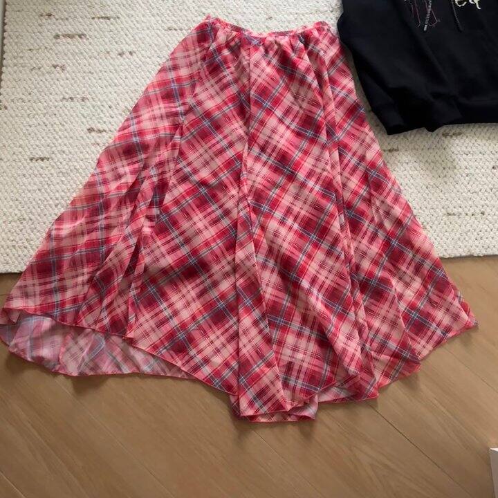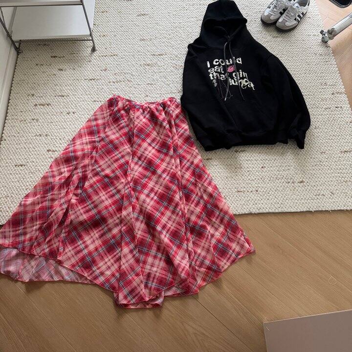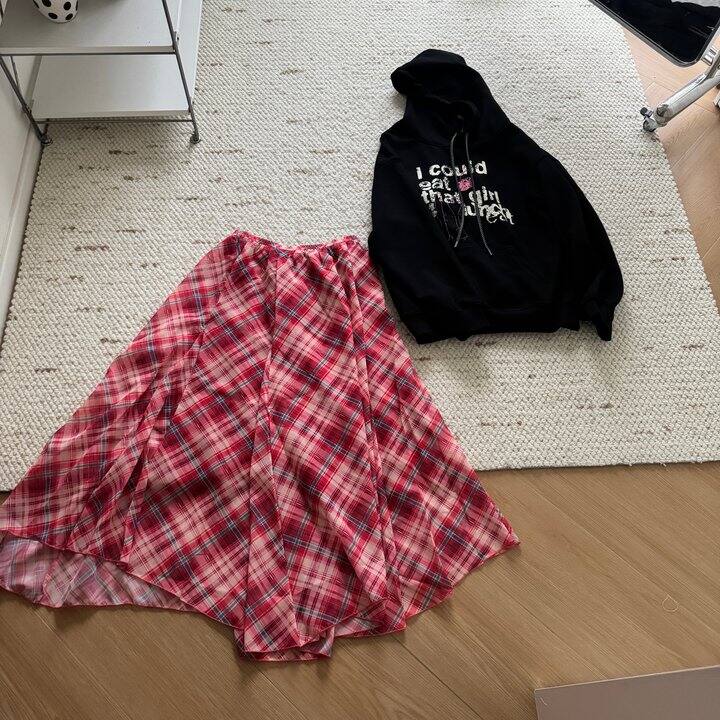 裙子不用多说炒鸡划算的一个价格,做的松紧腰对身材更包容,红格子会显得更有活力青春一些,搭配卫衣的印花颜色不会突兀很和谐的一套