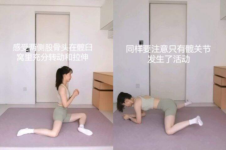 (产后运动复盘05,视频截图如下)髋关节灵活性训练:增加髋关节活动度,产后人群、久坐人群适用,也可以作为练臀前热身动作