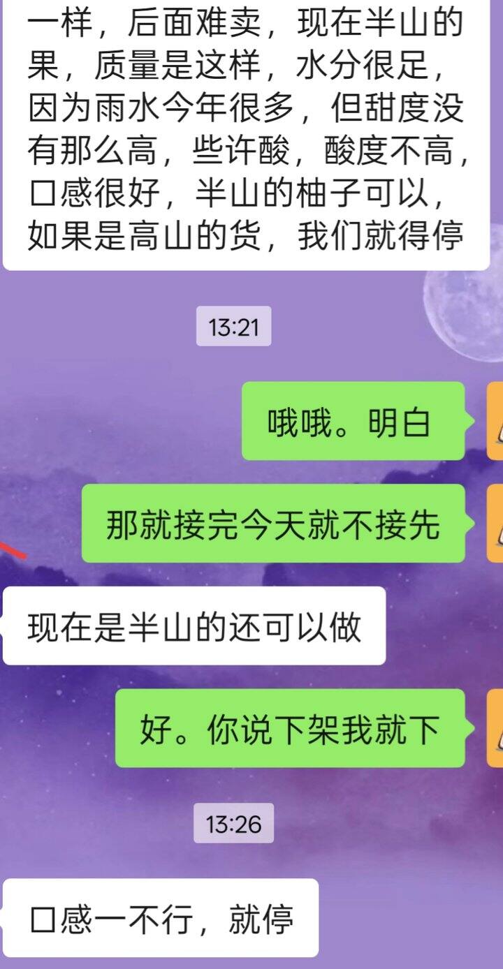 今年柚子遇到中秋国庆大卖,田里的卖完了现在卖半山的,半山的卖完,高山的水分会不足老板就不卖了,提早结束