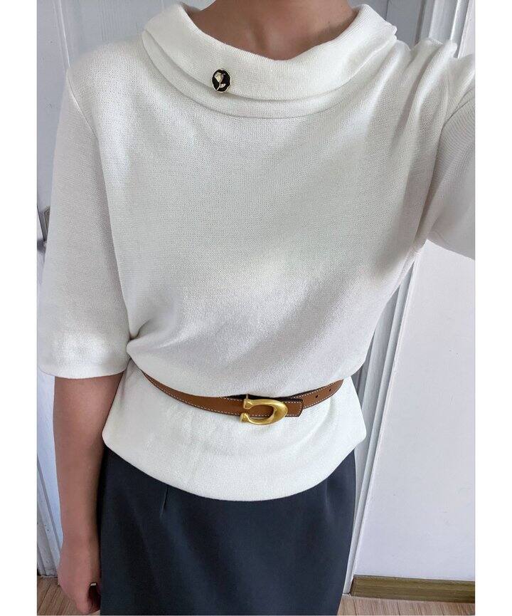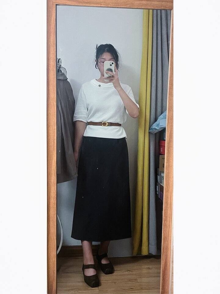 前几天买的这个上衣太长了,把下摆叠进去加个腰带,搭了一条灰色裙子,一双和腰带一个色系的鞋子,衣领上配个闲置的耳夹,整体还不错✌✌✌