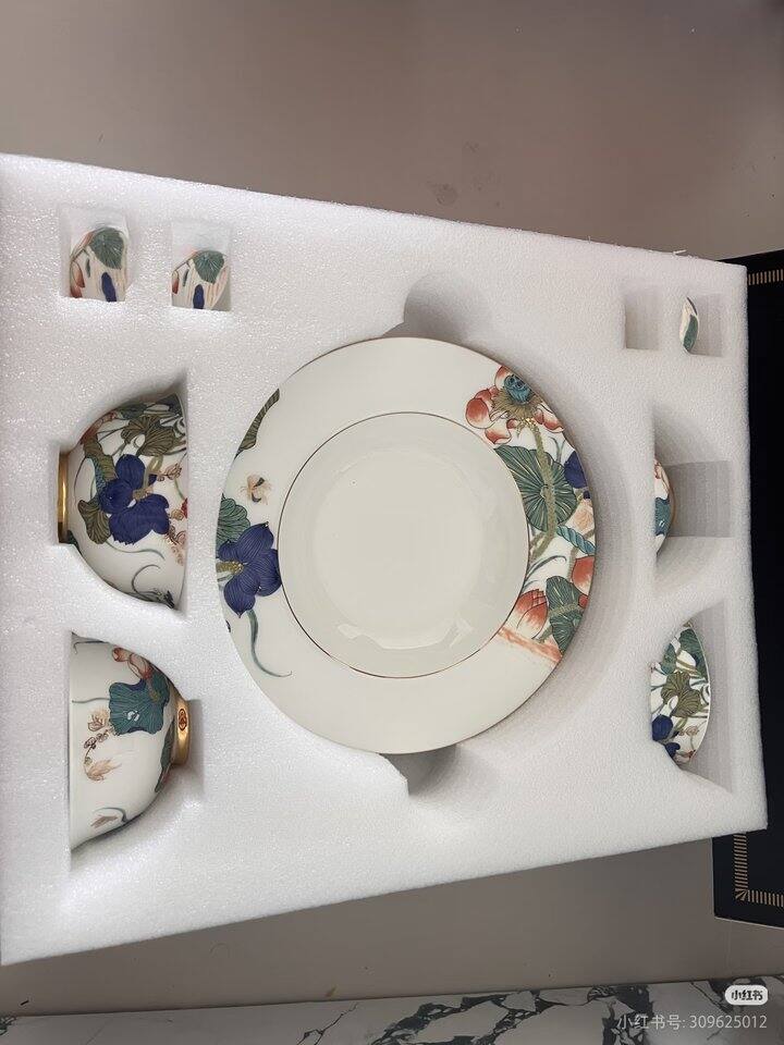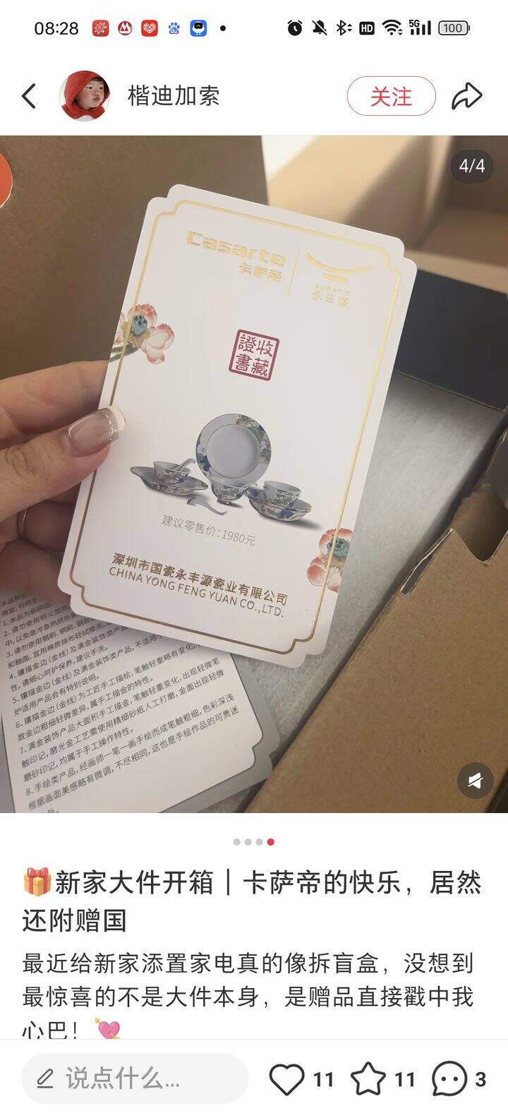 但是重点来了,我妈在a商场买了这三样之后,卡萨帝也就是海尔智家,不是商场送的,是品牌送的,送了这个瓷器,这个瓷器吊牌价1980,【国瓷永丰源】现在在淘宝上搜基本上也要在1500左右。