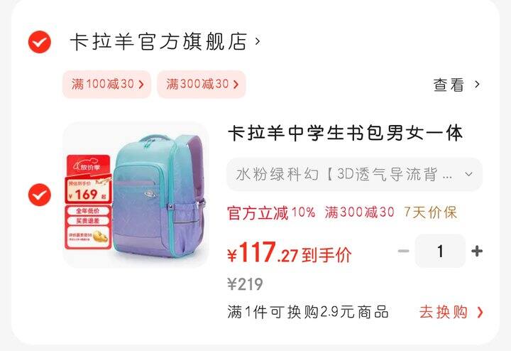 [闪耀]卡拉羊中学生书包【3D透气导流背负】