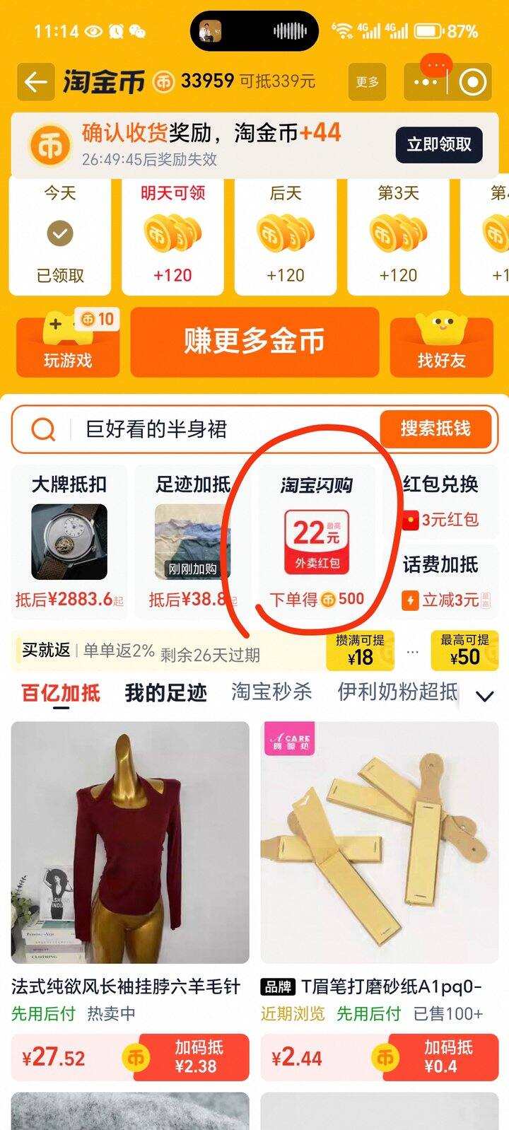 从淘金币的这个闪购入口进去,中间是淘金币可以抵扣 2 块,其他普通单是可以抵扣 0.5,再得 500 淘金币