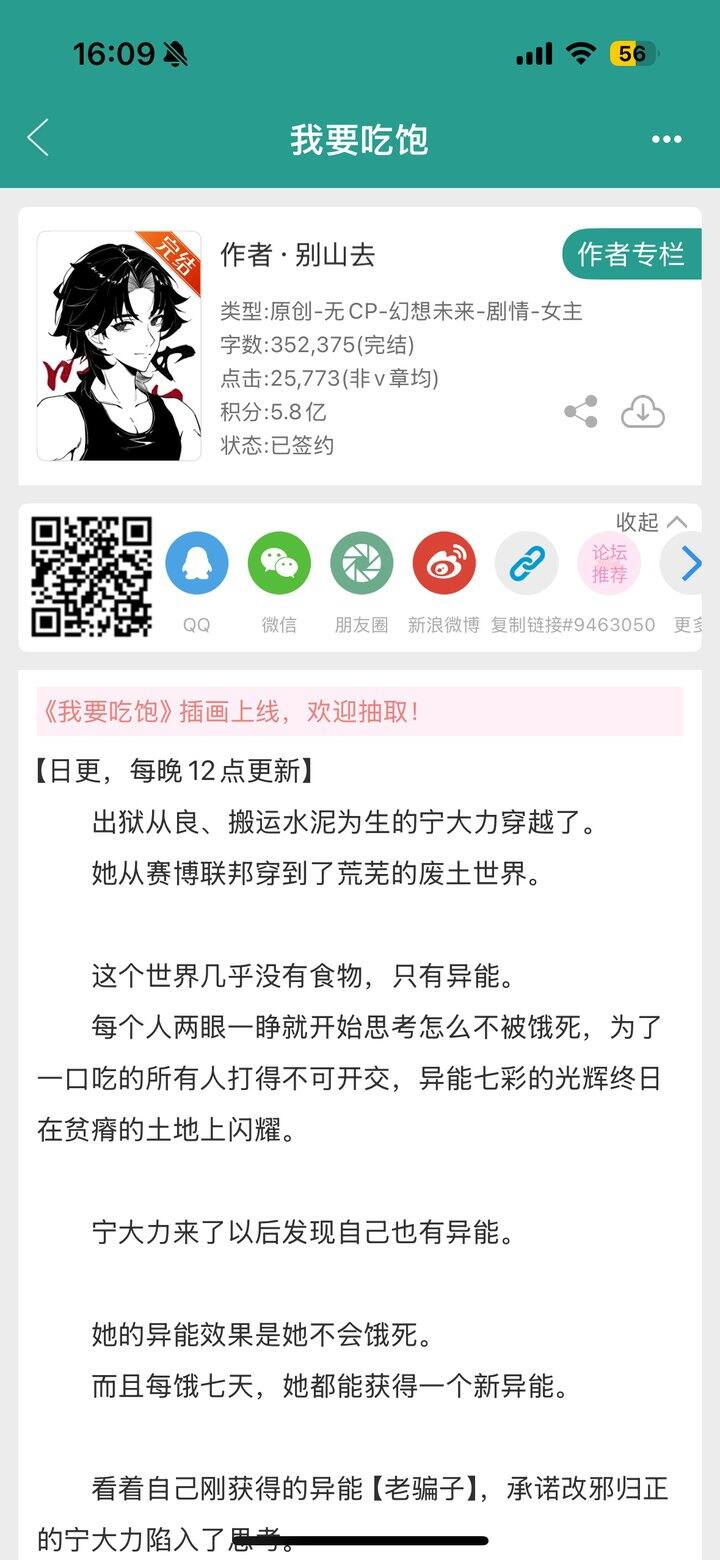 这本9月底刚完结的,女主宁大力来到饥饿异世求生存文,金手指就是女主的觉醒各种异能,她冷静清醒道德感一般。随着剧情发展她发现自己好像不是穿越来这个废土世界的,这里与原先的联邦有着千丝万缕的关系。末日生存类偶尔换换口味还可以。设定我很喜欢