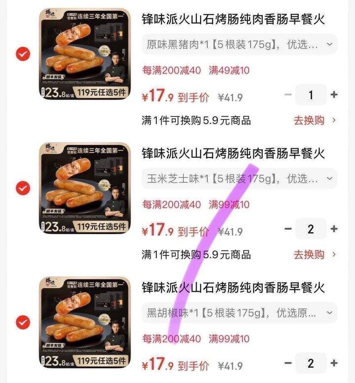 🌟锋味派火山石烤肠 纯肉香肠,领链接内70券后任选5件加购