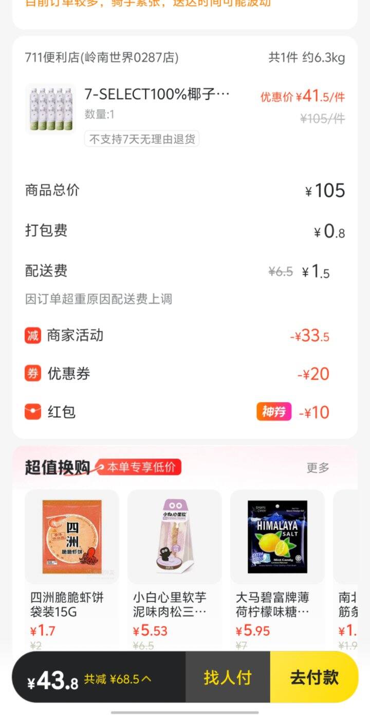 美团有一个59-20的零食券,买下来这个椰子水一箱四十多,之前直播间再凑单都要五十多,这个很清爽,加冰块喝更爽!今天没有的话明天早点刷新