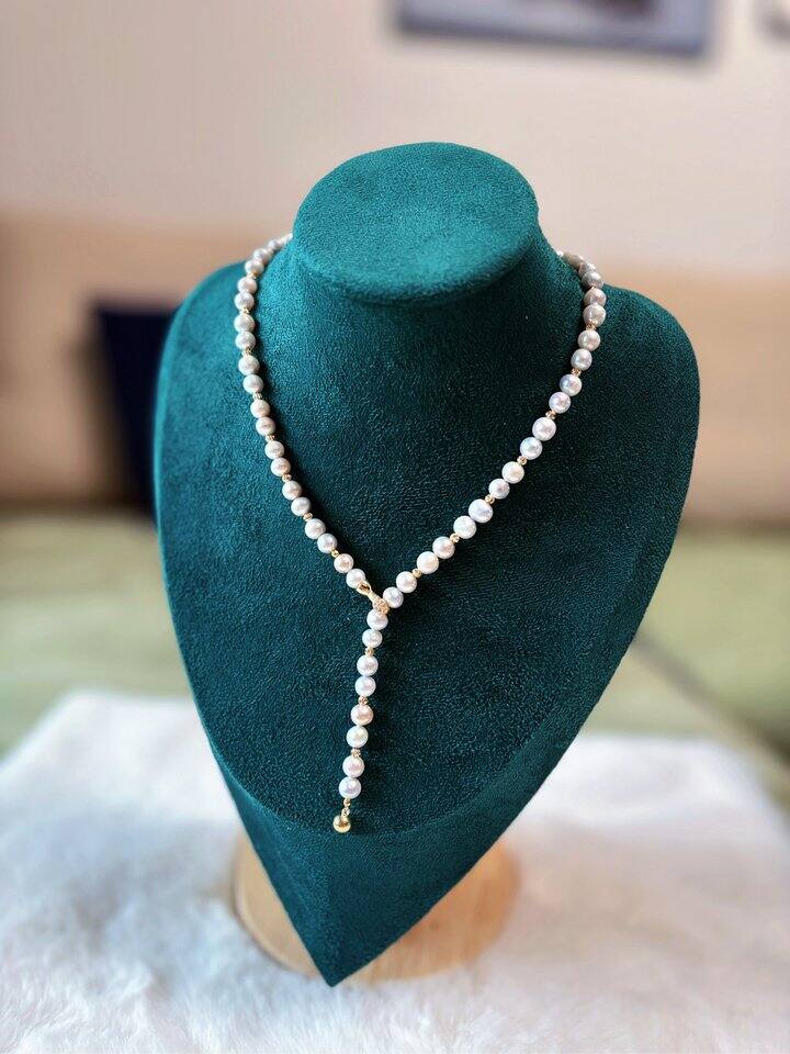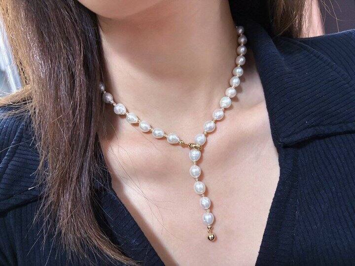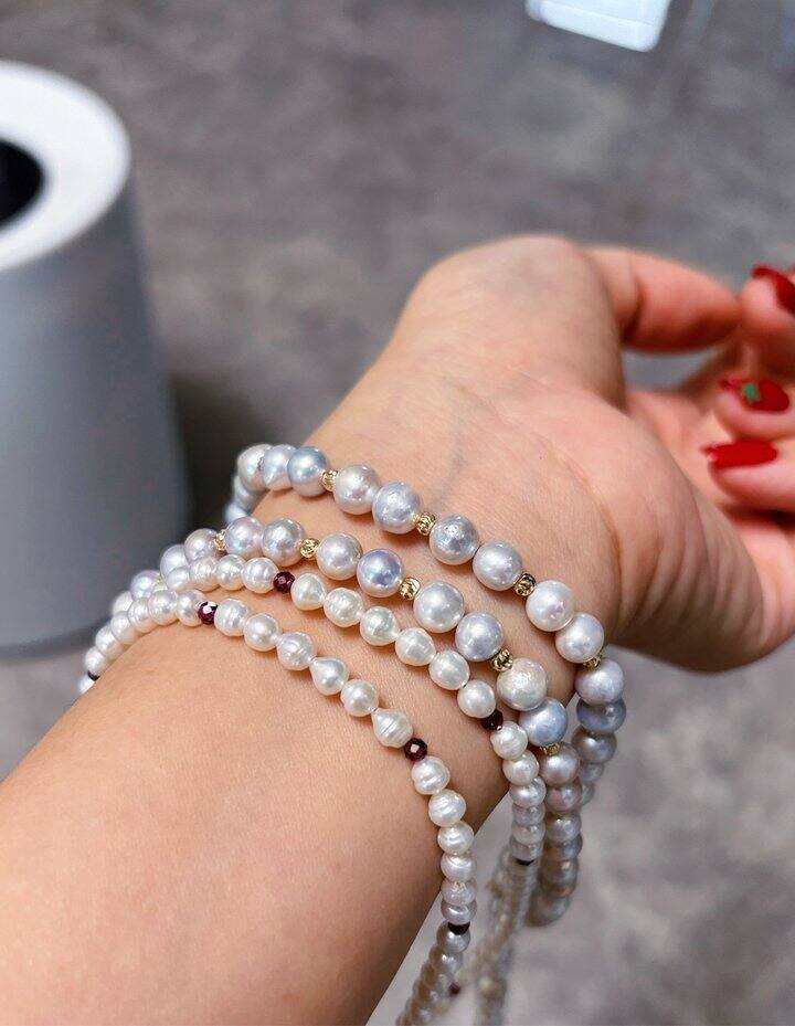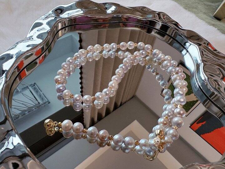 我当时还收了几条品质非常好的蓝灰色淡水珍珠,6~7的大小黄金点位。近圆,圆度很不错,表面微瑕,社交距离看不出来。自己看的话,不是完美主义也完全可以接受。