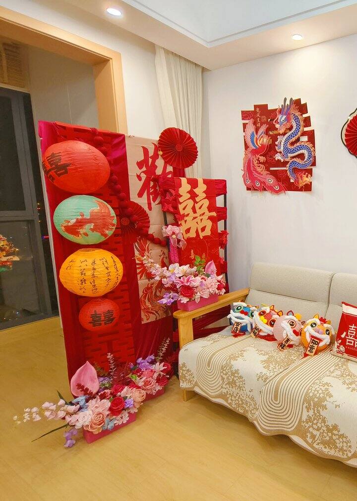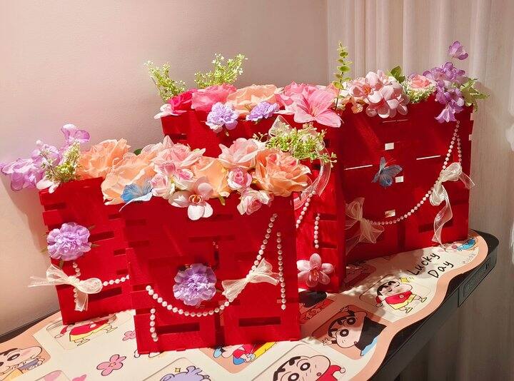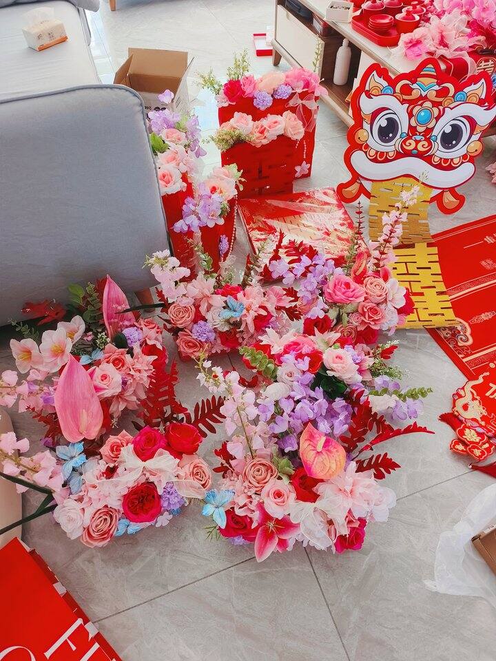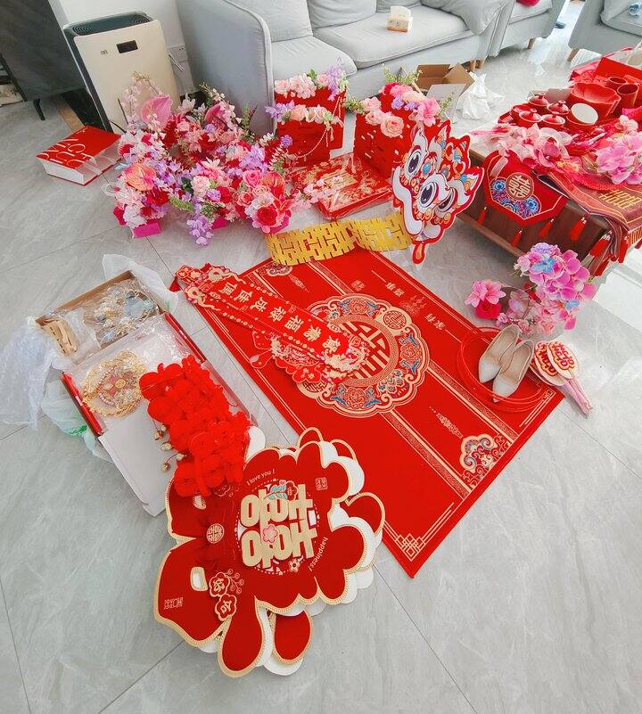 3️⃣晨袍背景布置(有金鱼风筝没拍到,不含花)(1.8m*0.8m,1.5m*0.5m) 💰90(送剩余的红色布幔)