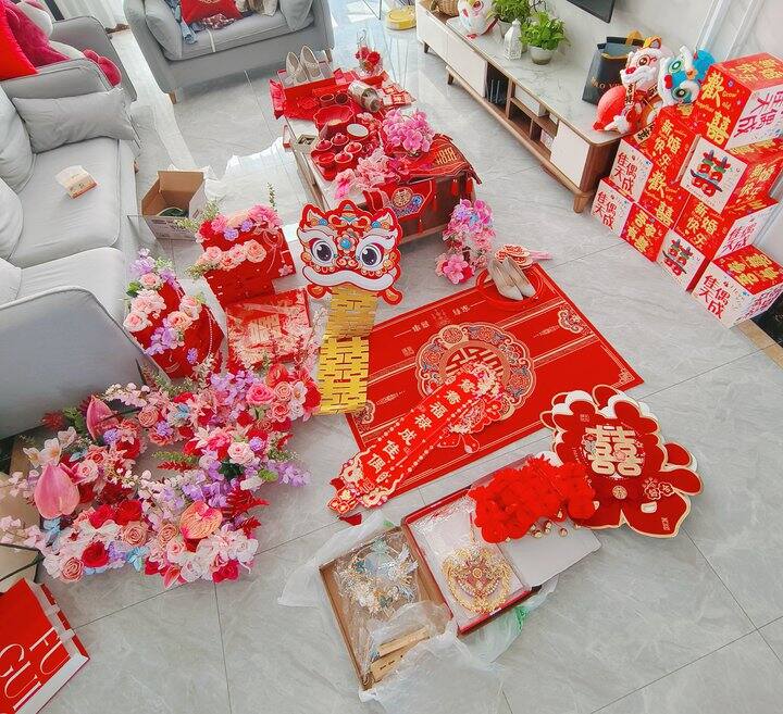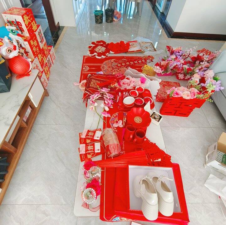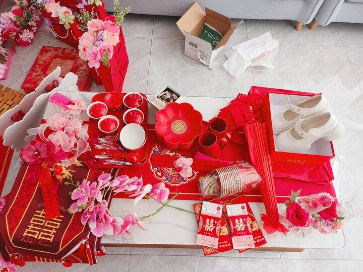 8️⃣茶杯*4,托盘*3,碗*2,喜勺*2,漱口杯*2,果盘*12,跪垫*2,万元改口红包*2,1w练功券*2,拉花喜*6,永生花戒指*2,假花经酒杯*2,喜伞,磁吸对联,立体喜字铃铛*8,立体舞狮喜,舞狮灯笼*4,💰90 (送一次性喜碗一次性喜杯,喜字条*10,单元门大喜*4,喜立体纸盒*10)