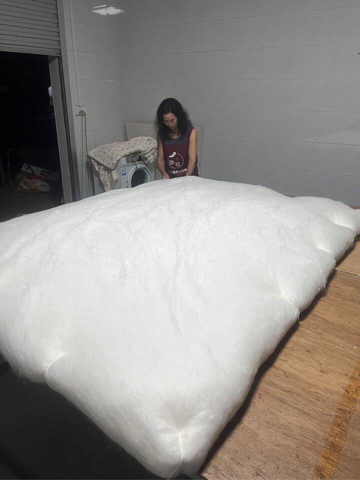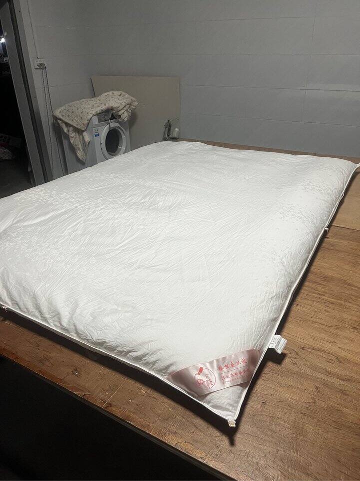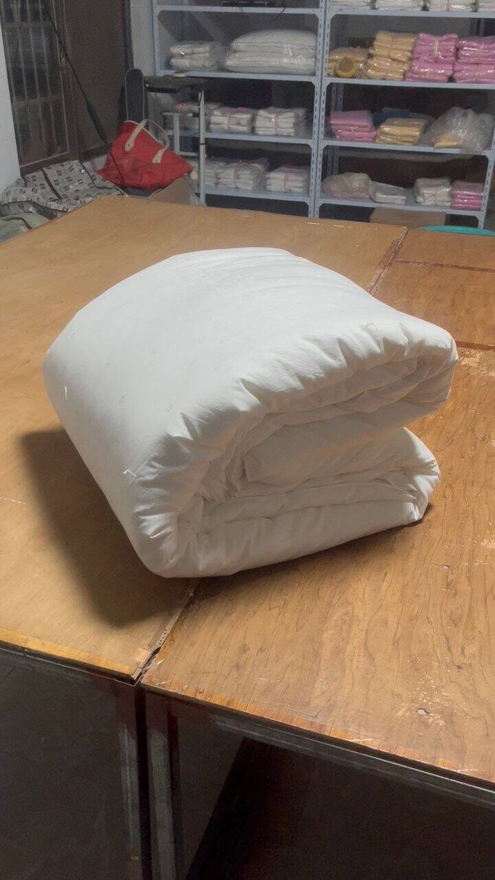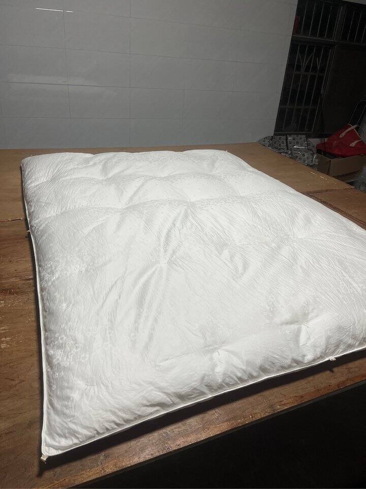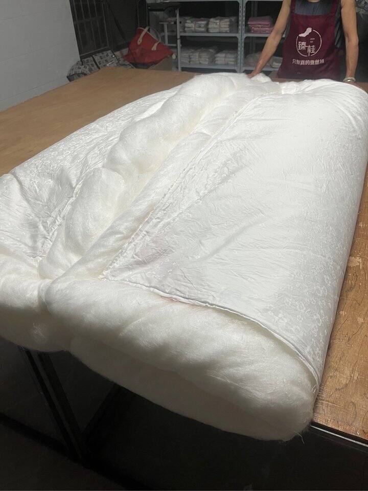 给河南朋友定制的一个单人6斤的蚕丝被,蚕丝净重6斤用的是这款白提花的内胆,这个尺寸做6斤是非常厚的了,冬天足够用。